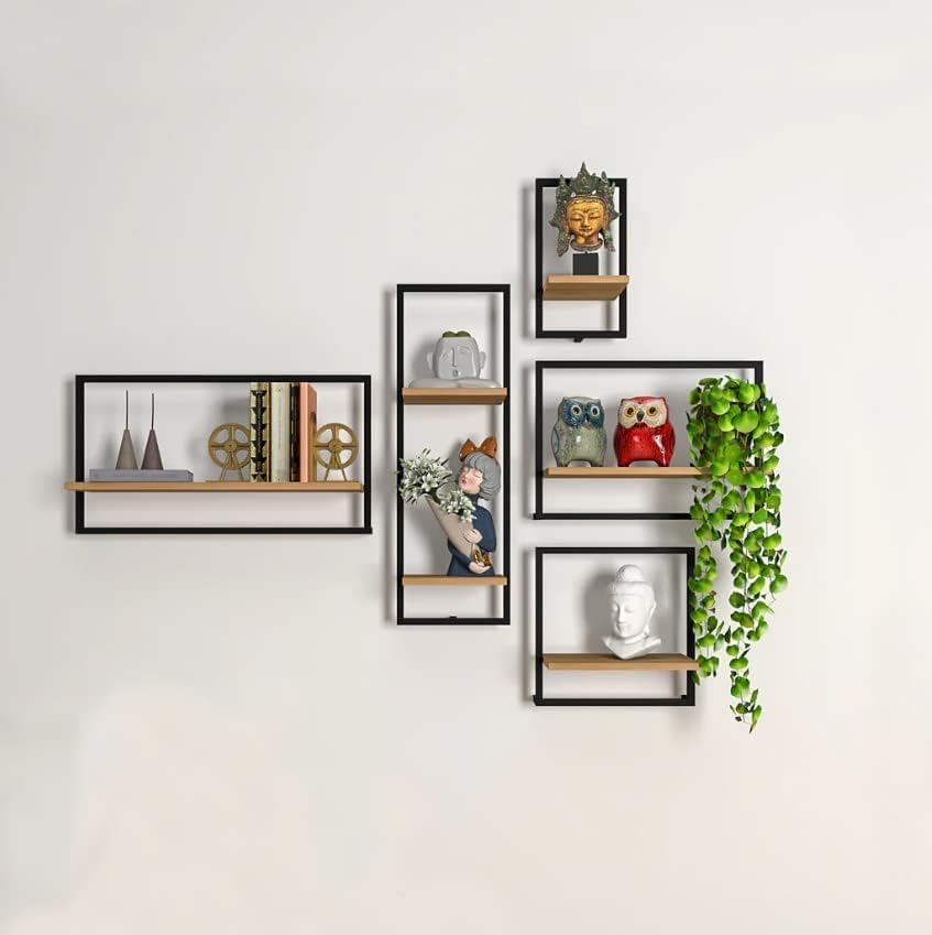 URKV Solid Wood Floating Shelves Wall Shelf for Bedroom | Wooden Hanging Shelf Black Metal Iron and Wood Set of 5 Wall Shelves Cube Decoration Floating Unit Frame