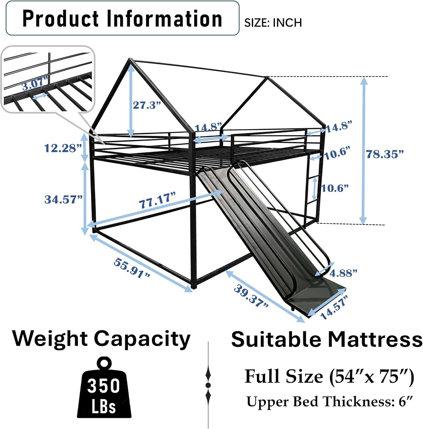 • The bunk bed frame is made of high-quality metal, which is stable and durable. The surface of the steel pipe has been carefully treated, which is more environmentally friendly and healthier for us. Upper bed and Down bed with 11 secured metal slats, strong support is provided for the mattress.