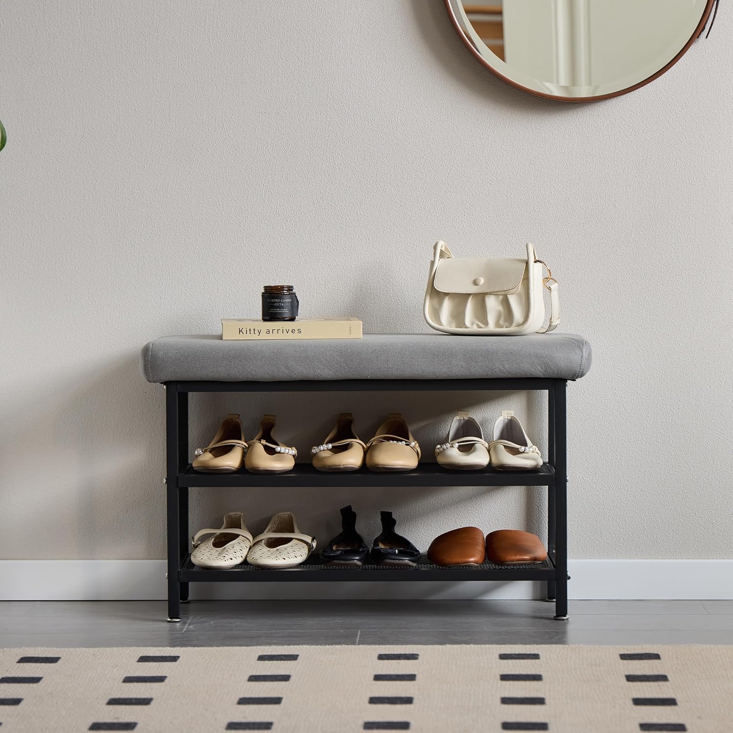- 【Stable Structure】 The frame of the shoe bench is made of high-quality metal coated with a rust proof layer,, this bench supports up to 350 lbs. The bottom is equipped with foot pads, which can effectively protect the floor and increase stability.