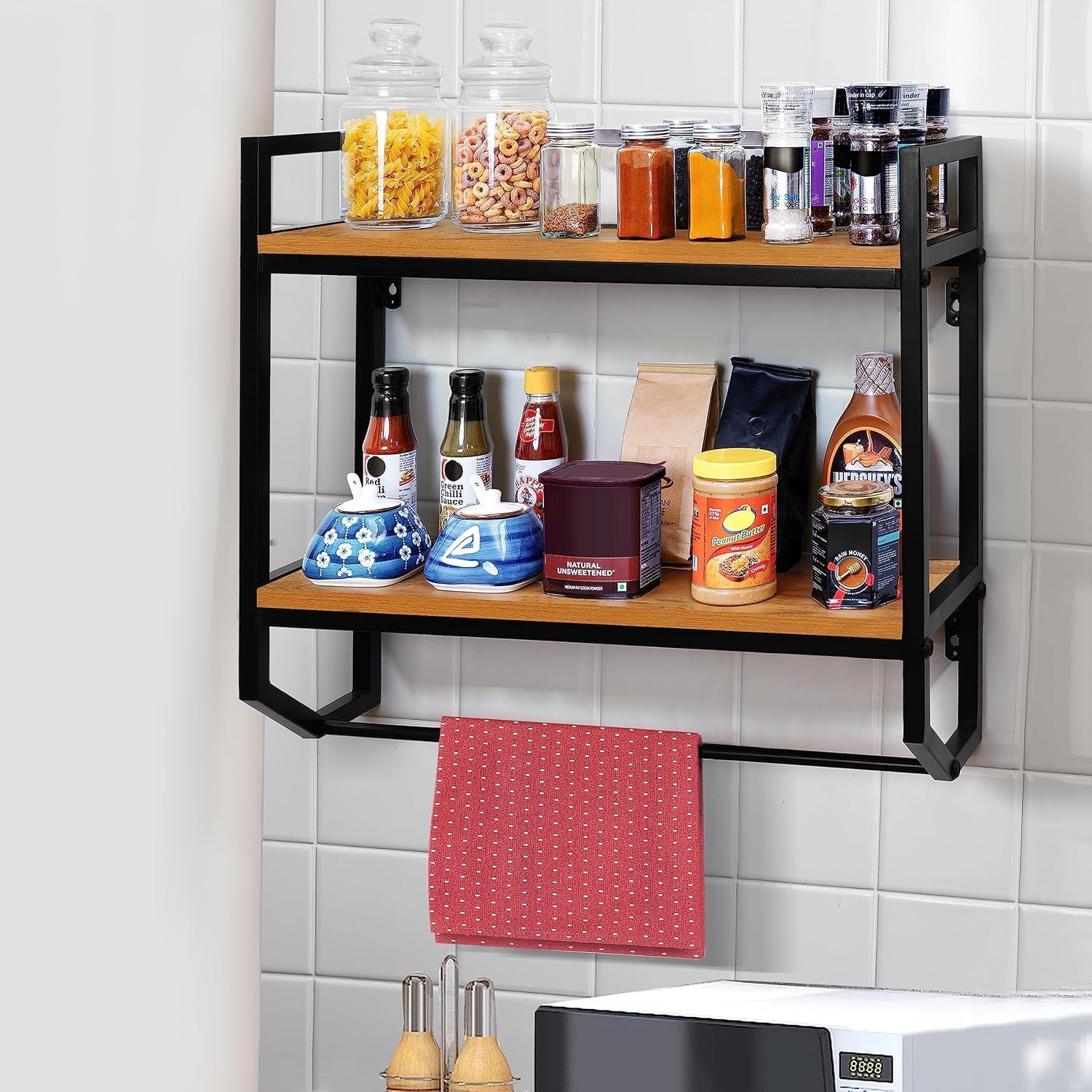 URKV Wall Mounted Kitchen Shelf Rack with Towel Holder | Wooden & Metal Storage Organizer for Kitchen, Bathroom & Home (Natural Finish)
